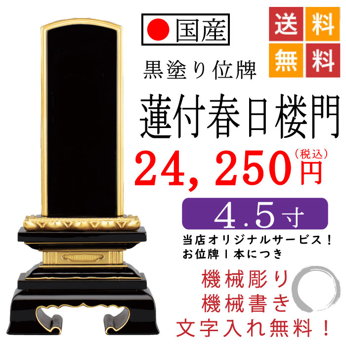 | 備考 | 【商品詳細】 人気の高い蓮付春日楼門の国産品です。黒塗りで仕上げたお位牌を金沢で作られた本金粉をふんだんに使用し、縁金で仕上げた落ち着きのあるお位牌です。黒の札板に金文字がしっかりと映えます。【文字入れについて】 当店のオリジナルサービスとして、『機械彫り文字』及び『機械書き文字』は新調されたお位牌1本につき1霊まで無料です。1霊+2,800円にて本金粉による手書き文字での文字入れも承っております。 注文時、「専用申し込みフォーム」より戒名及び法名をご記入ください。旧字体や変換しても出てこない文字がある場合には該当する文字の部分に「○」とご記入ください。ご注文いただいてから当店より確認の御連絡をさせていただきます。その他ご質問やご要望がございましたらお気軽に御連絡ください。ご不明な点やご要望などございましたらお気軽にご連絡ください。 ※お位牌をご注文いただいた全ての方に「確認用レイアウト」をメール又はFAXにて送付いたします。お客様に確認いただいた後に製作へと進ませていただきます。 |