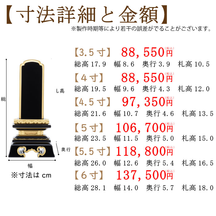 | 備考 | 【商品詳細】 本漆と本金粉を使用し、細部まで丁寧に造られた国産位牌です。塗面は下地から上塗りまで幾度となく塗りを重ね、蝋色(磨き上げ)にて仕上げられています。綺麗に縁取られた金粉は、金沢産を使用しており長年経っても色あせることはありません。大切な故人を偲ぶにふさわしい高級位牌です。【文字入れについて】 当店のオリジナルサービスとして、『機械彫り文字』及び『機械書き文字』は新調されたお位牌1本につき1霊まで無料です。1霊+2,800円にて本金粉による手書き文字での文字入れも承っております。 注文時、「専用申し込みフォーム」より戒名及び法名をご記入ください。旧字体や変換しても出てこない文字がある場合には該当する文字の部分に「○」とご記入ください。ご注文いただいてから当店より確認の御連絡をさせていただきます。その他ご質問やご要望がございましたらお気軽に御連絡ください。ご不明な点やご要望などございましたらお気軽にご連絡ください。 ※お位牌をご注文いただいた全ての方に「確認用レイアウト」をメール又はFAXにて送付いたします。お客様に確認いただいた後に製作へと進ませていただきます。 |