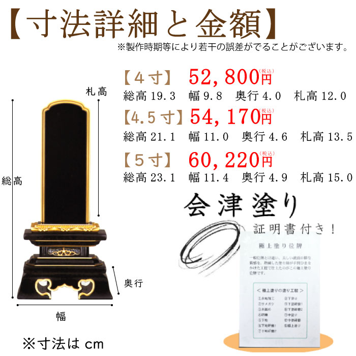 | 備考 | 【商品詳細】 台座の塗りに特徴のある「勝美位牌」の極上塗りタイプ。日本の職人が下地や塗りを幾重にも繰り返し、本漆を使用し丁寧に仕上げました。さらに本金粉を使用しているので長年使用されても色あせることなく、安心してご利用いただけます。【文字入れについて】 当店のオリジナルサービスとして、『機械彫り文字』及び『機械書き文字』は新調されたお位牌1本につき1霊まで無料です。1霊+2,800円にて本金粉による手書き文字での文字入れも承っております。 注文時、「専用申し込みフォーム」より戒名及び法名をご記入ください。旧字体や変換しても出てこない文字がある場合には該当する文字の部分に「○」とご記入ください。ご注文いただいてから当店より確認の御連絡をさせていただきます。その他ご質問やご要望がございましたらお気軽に御連絡ください。ご不明な点やご要望などございましたらお気軽にご連絡ください。 ※お位牌をご注文いただいた全ての方に「確認用レイアウト」をメール又はFAXにて送付いたします。お客様に確認いただいた後に製作へと進ませていただきます。 |