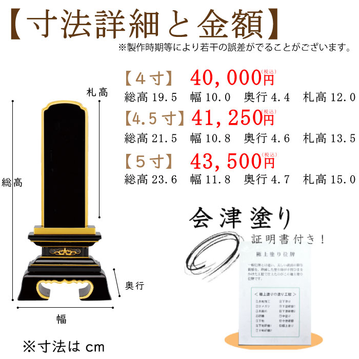 | 備考 | 【商品詳細】 最も普及している春日楼門型の「極上塗り」タイプです。本漆を幾度となく塗り重ね鏡面のような仕上がりになっています。台座には金沢産の本金粉を使用しているので長年にわたり色あせることはありません。国産位牌の細部にわたる丁寧な仕上がりを感じることのできるお位牌です。【文字入れについて】 当店のオリジナルサービスとして、『機械彫り文字』及び『機械書き文字』は新調されたお位牌1本につき1霊まで無料です。1霊+2,800円にて本金粉による手書き文字での文字入れも承っております。 注文時、「専用申し込みフォーム」より戒名及び法名をご記入ください。旧字体や変換しても出てこない文字がある場合には該当する文字の部分に「○」とご記入ください。ご注文いただいてから当店より確認の御連絡をさせていただきます。その他ご質問やご要望がございましたらお気軽に御連絡ください。ご不明な点やご要望などございましたらお気軽にご連絡ください。 ※お位牌をご注文いただいた全ての方に「確認用レイアウト」をメール又はFAXにて送付いたします。お客様に確認いただいた後に製作へと進ませていただきます。 |